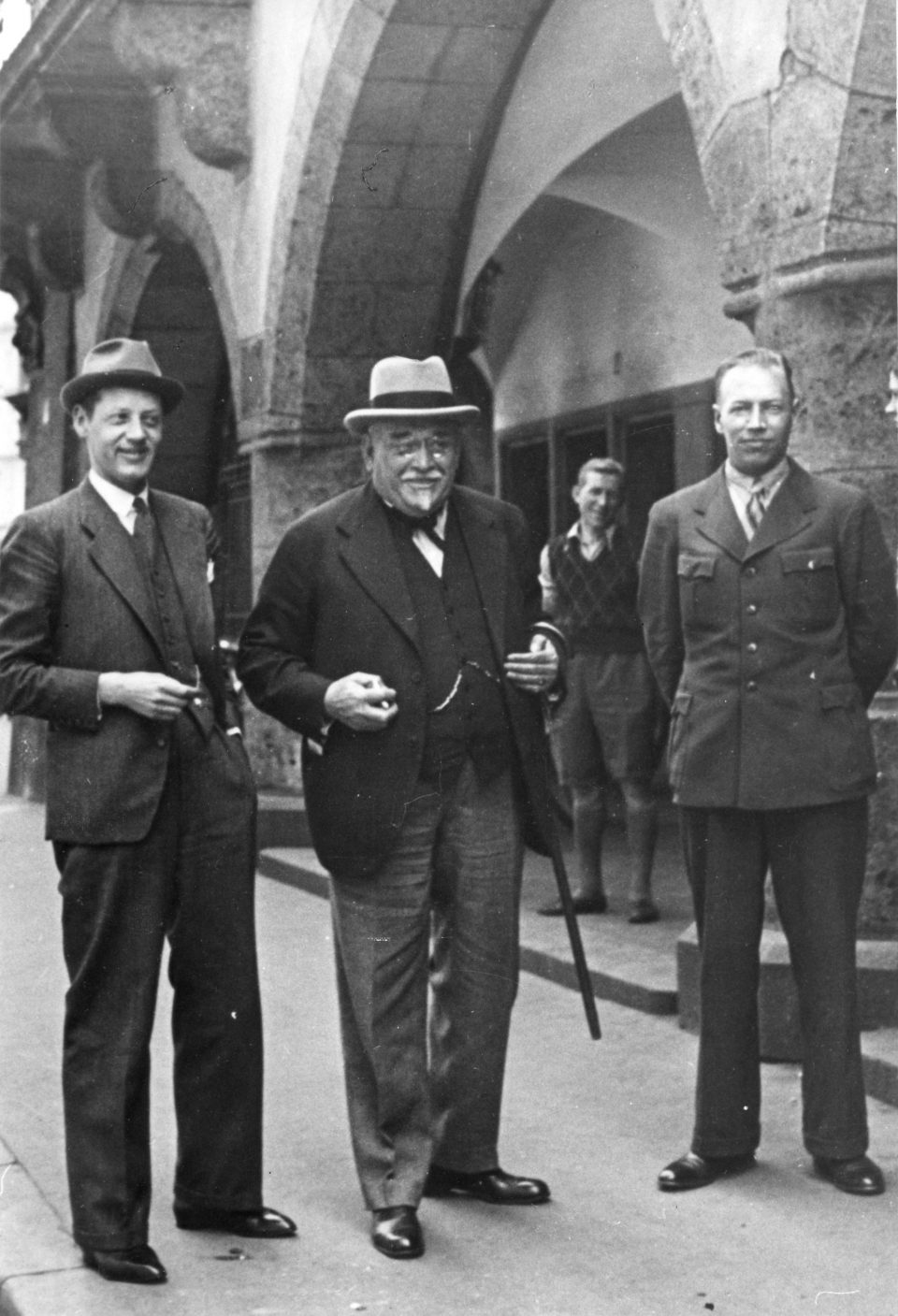 Vuorineuvos Anders Kramer Berliinissä vuonna 1937. Vasemmalla Ahlbom, joka toimi Karhulan tehtaiden edustajana Brysselissä. Oikealla autonkorjaaja Oskar Skutvik.