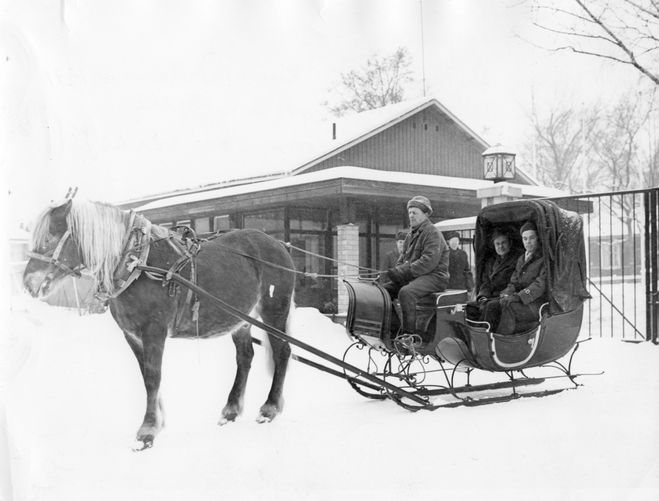 Tehtaan portilta, takana vanha ruokala. William Ruthin reki kunnostettuna vuonna 1971. Reessä istumassa dipl.ins. Folke Pettersson (oik.) ja maisteri Erkki Noronkoski.