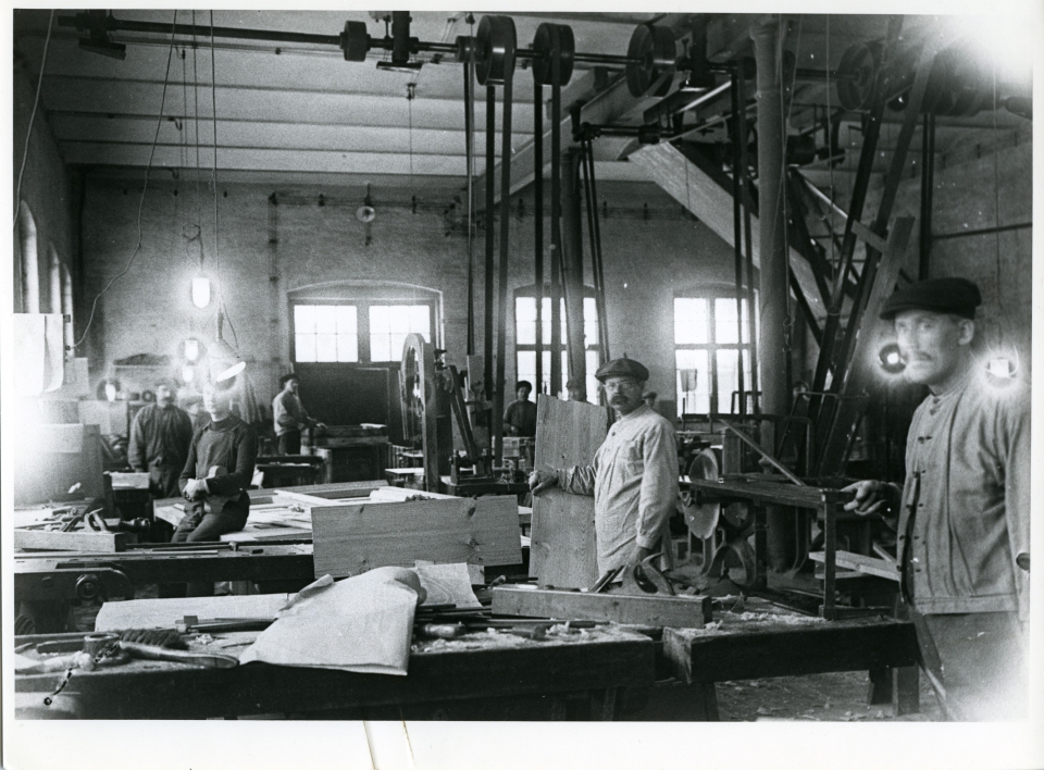 Malliveistämön alakerta vuonna 1902. Tästä veistämö siirtyi vuonna 1949 konepajan konttorirakennukseen.