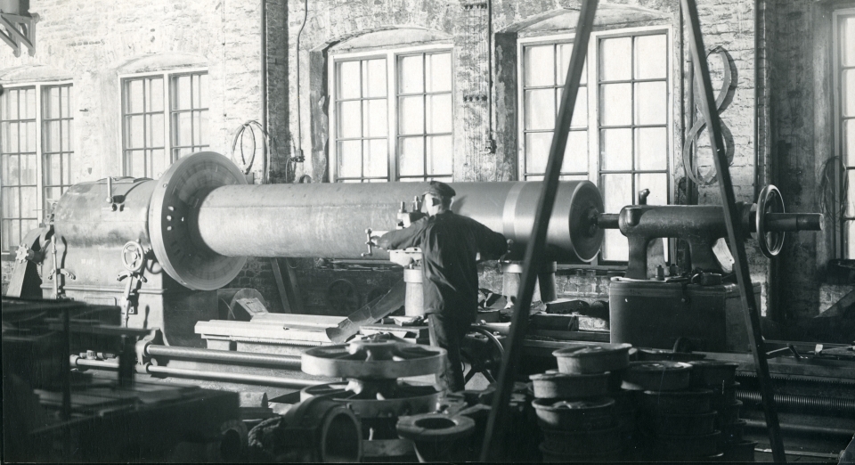 Vanha koneistamo 1920-luvulla. Puuhiomon putkitelan sorvaus.