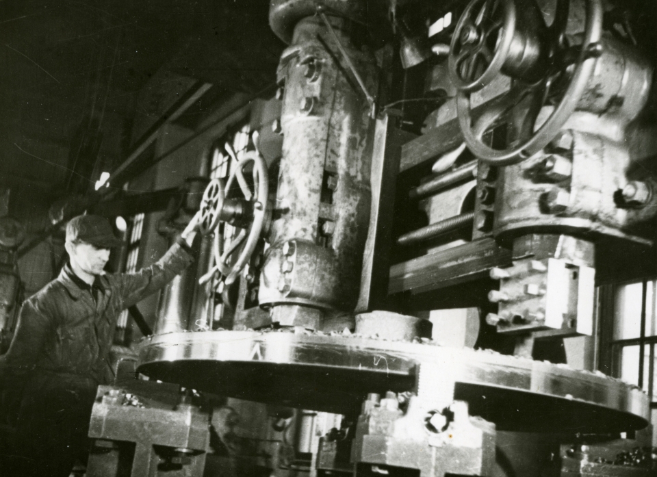 Koneistamo 1950-luvulla. Rimahakkurin teräpyörän terälovien jyrsintä. Kuvassa jyrsijä Kauko Tarvonen.