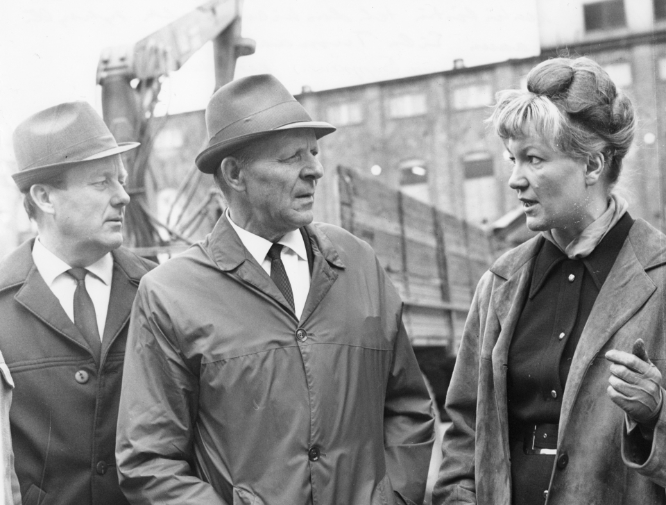 Tehdaskierroksella kartonkitehtaalla 4.10.1970. Oppaana Eila Tuomaala. Vas. Reino Mattila ja Jorma Seppänen.
