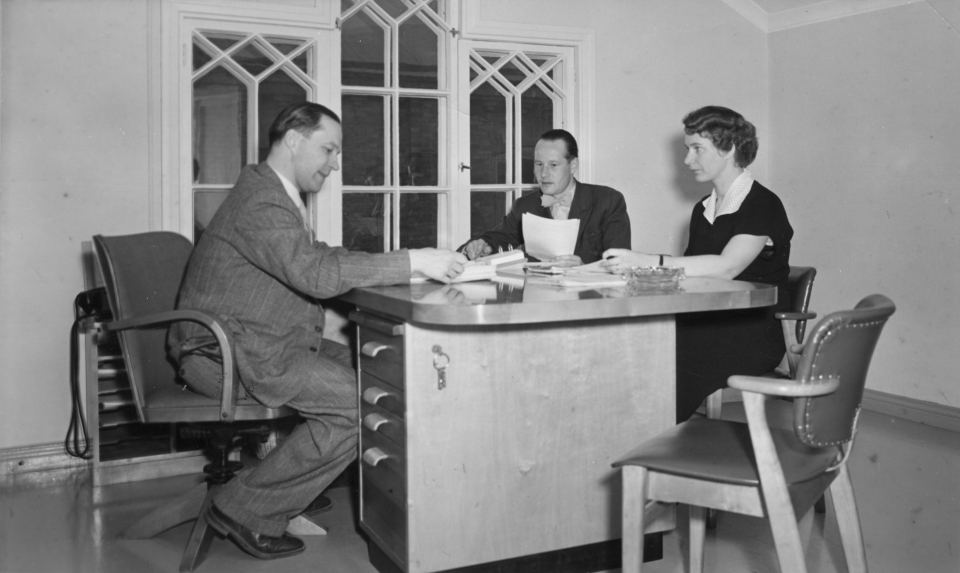 Työvoima-asiainosasto, perustettu 1954. Insinööri Martti Hjelt, Reimo Lammentausta ja sihteeri Hilkka Riiho.
