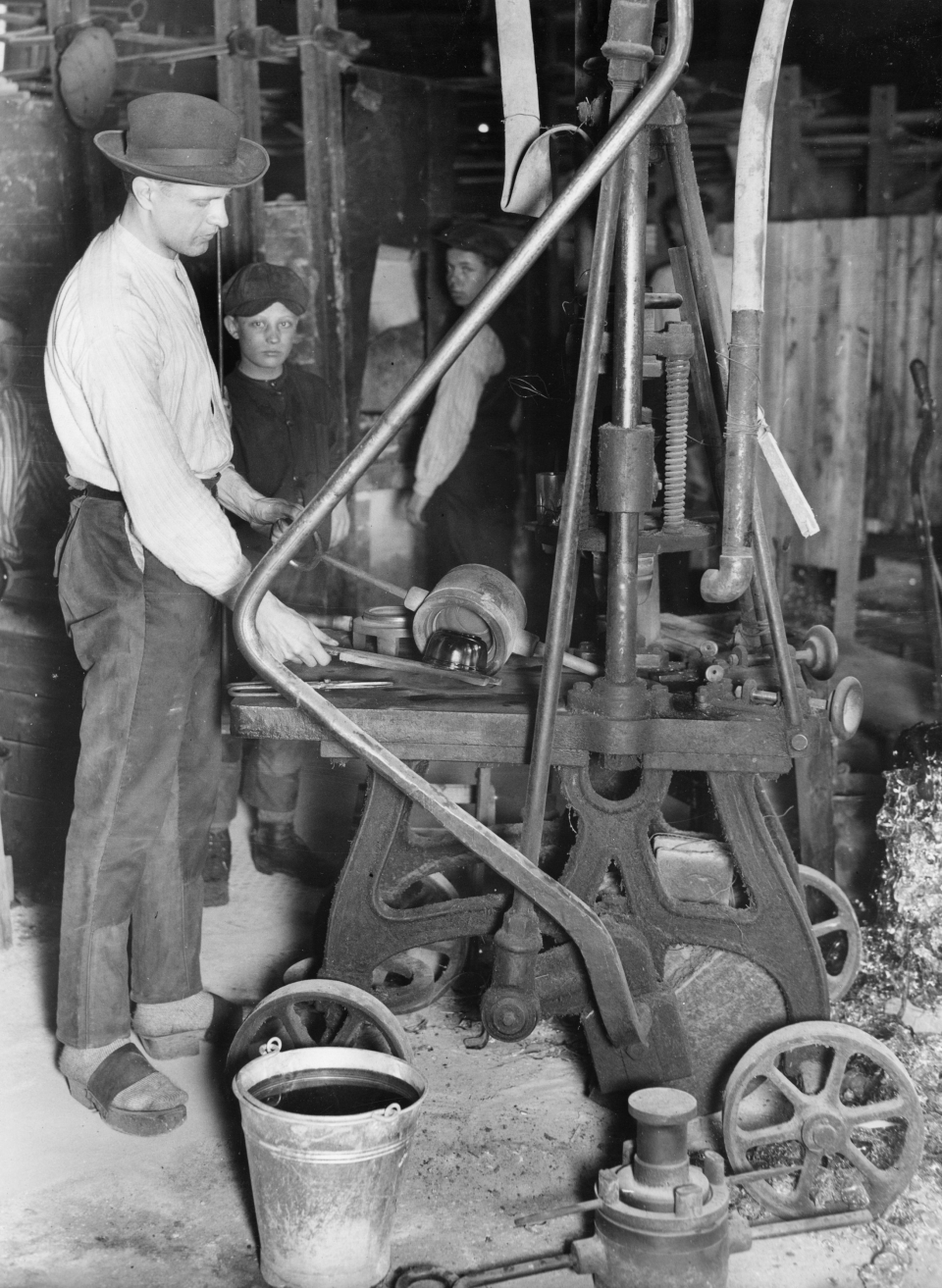 Otto Penttilä tekemässä viilikulhoja puristuskoneella 1930-luvulla.