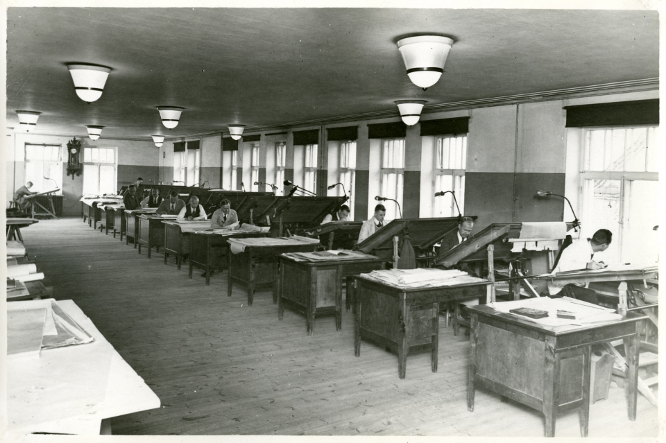 Konepajan piirustuskonttori 1920-30 -luvulla.