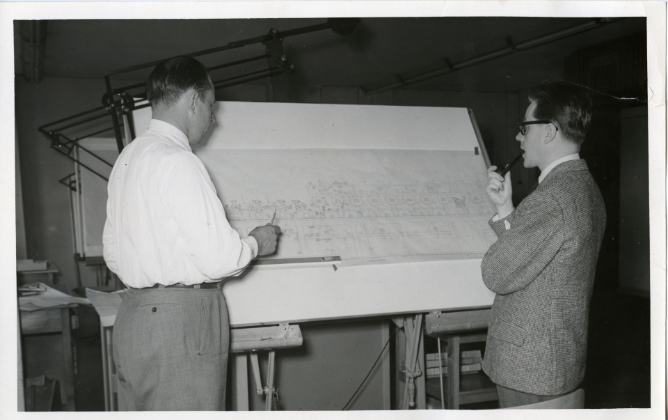 Konepajan piirustuskonttori 1950-1960 -lukujen vaiheilla. Kuvassa oikealla osaton päällikkö Sven Westerholm ja vasemmala suunnittelija Yrjö Tervakorpi.