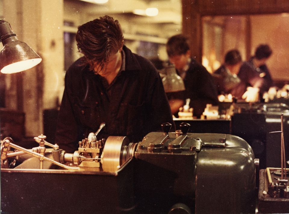 Konepajakoulu 1970-luvulla. Sorvausta revolverisorvilla.