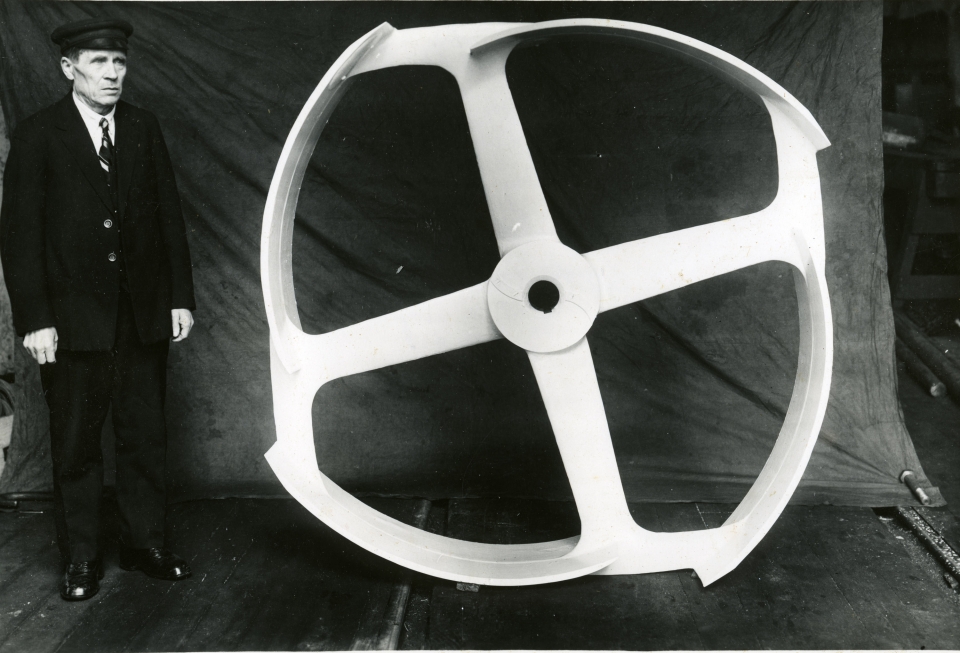 Tj. Heikki Luukkonen kokoonpano-osastolla 1920-luvulla. Vieressä massansekoittaja.