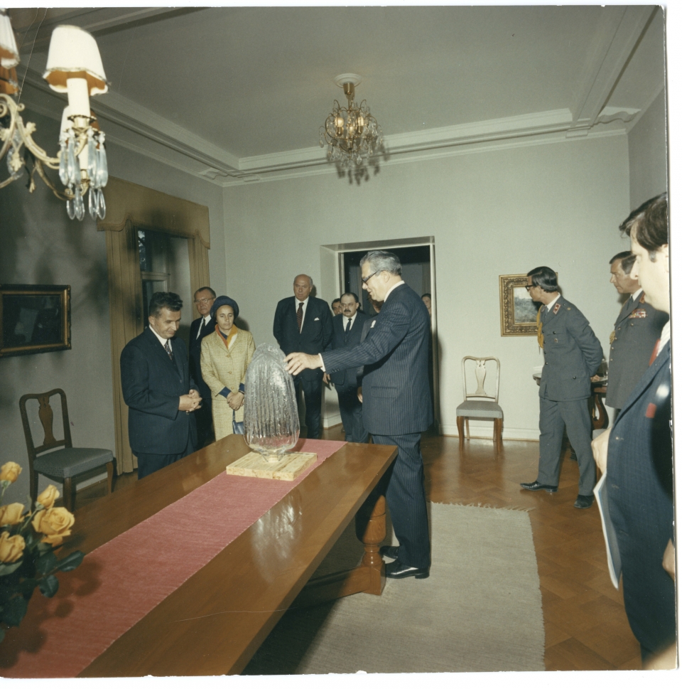 Rehbinder luovuttaa lahjan Nikolae Ceaucesculle ja Elena Caucesculle. Keskellä takana Borje Ahlström Ceauceskujen takana Ahlströmin lasiteoll. Johtaja Lauri K. J. Tukiainen.