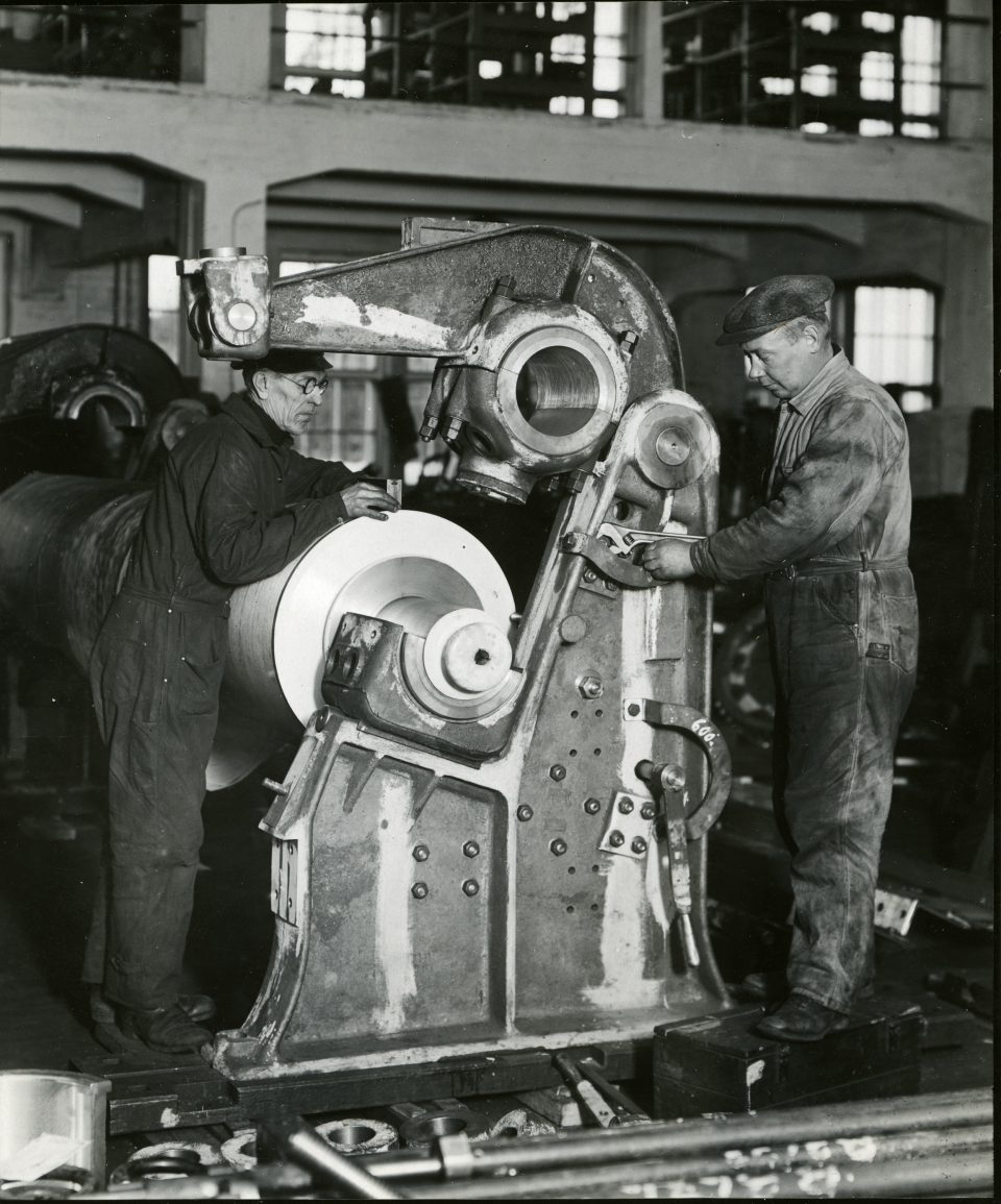 Kamyr-hupapuristimia asennusosastolla 1930-luvulla. Oikealla asentaja Väinö Juura.
