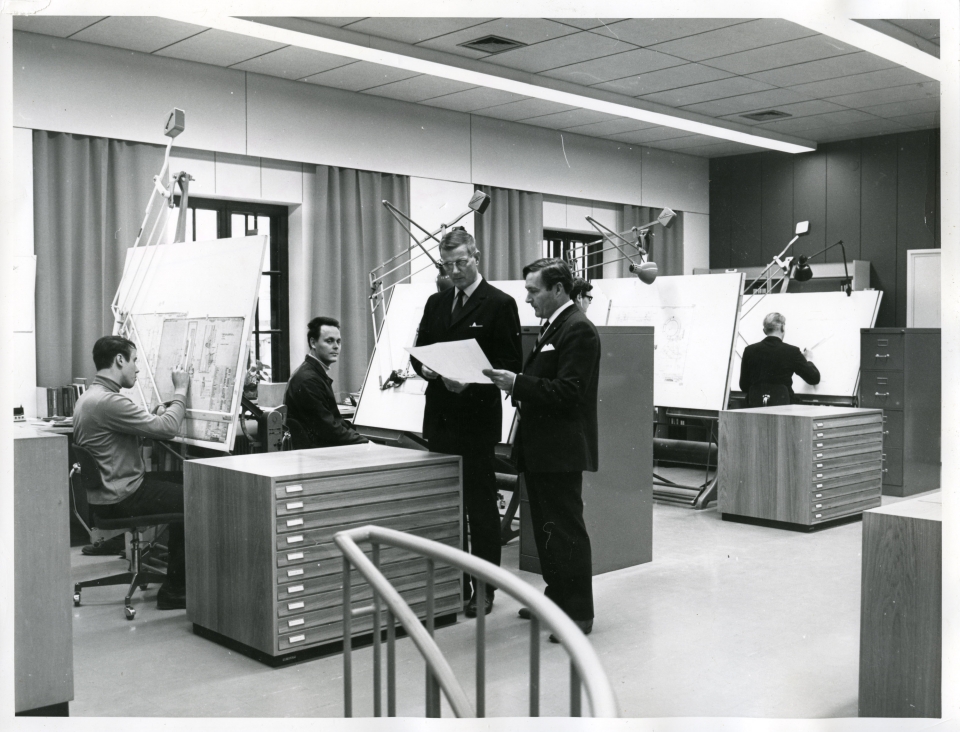 Piirustuskonttori. Vasemmalla V. Hokkanen (?) ja oikealla E. Lönqvist.