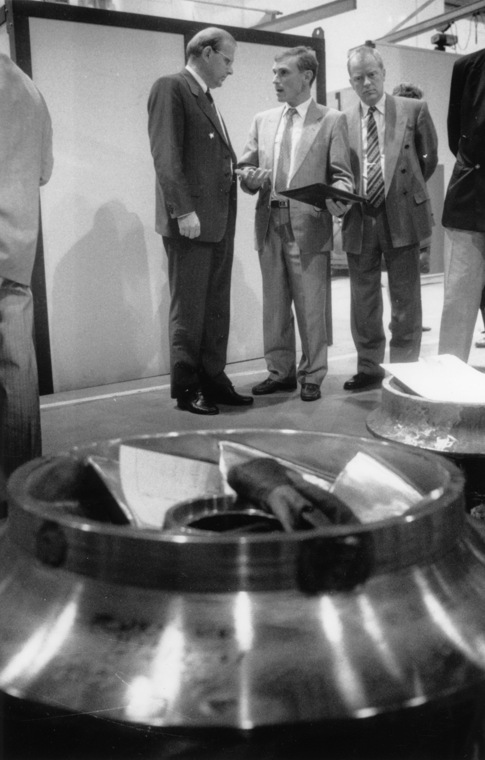 Pääjohtaja Krister Ahlström, Samppa Ahtiainen ja Thorleif Blok Karhulan pumpputehtaalla.