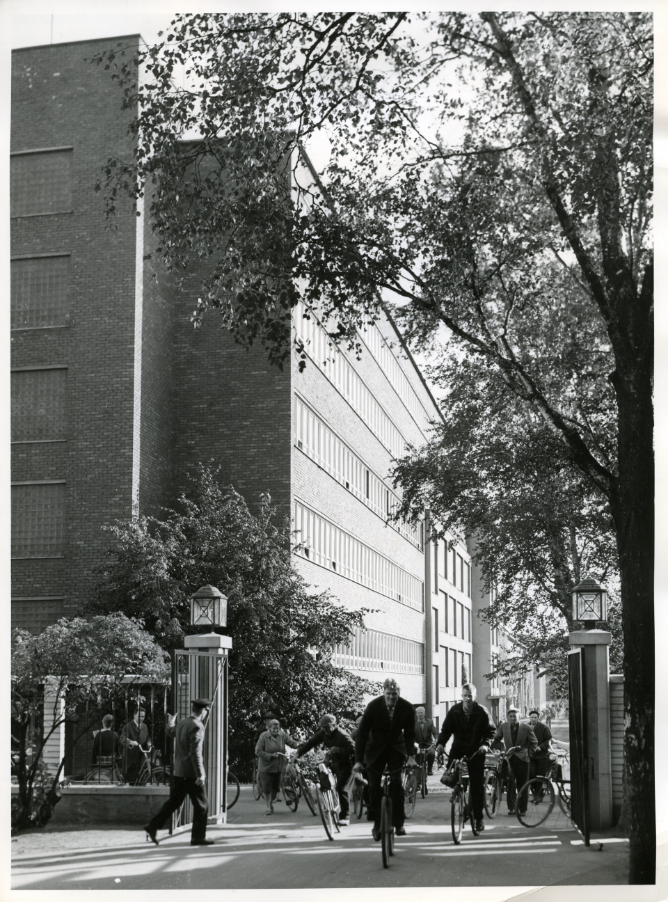 Konepaja ja pääportti 3.9.1962. Työväki poistumassa tehtaalta.