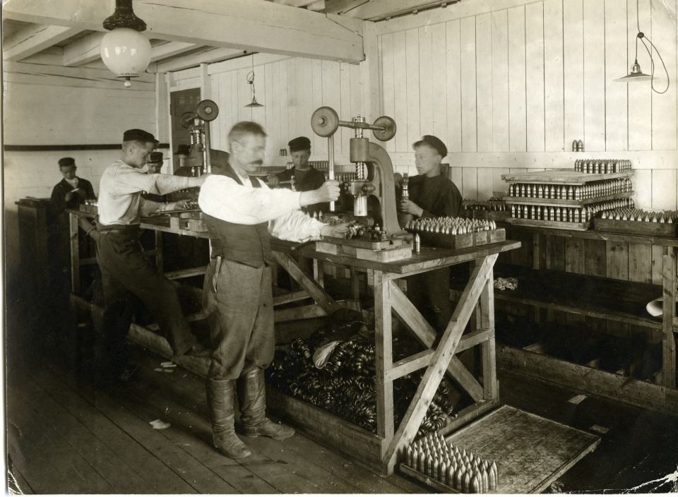 Patruunojen valmistusta konepajalla 1910-luvulla