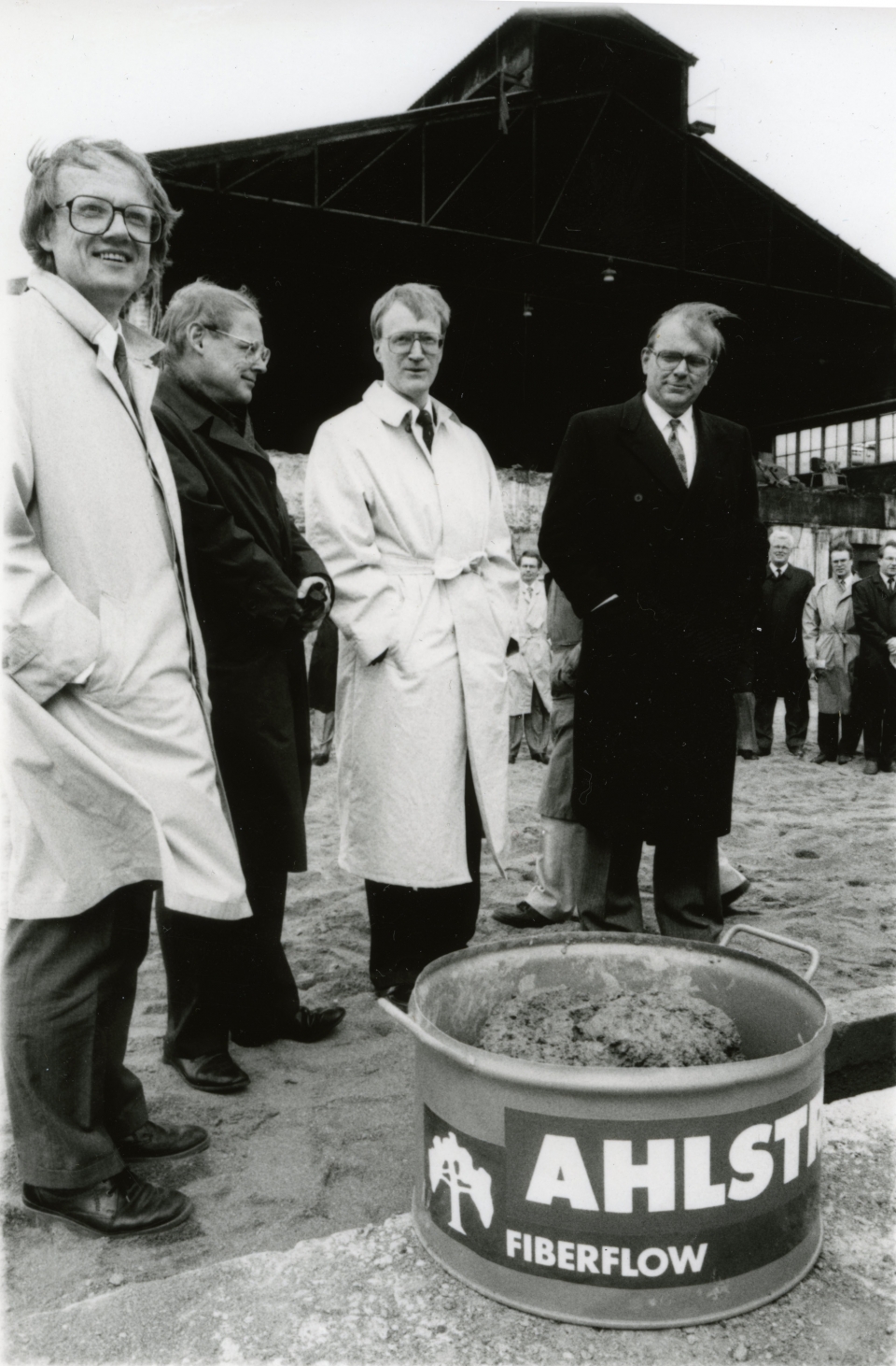 Fiberflow tutkimuskeskuksen peruskiven muuraustilaisuudessa Karhulassa. Oikealta Kaj Henrikson, Arto Elo, kaupungin johtaja Risto Parjanne ja Krister Ahlström.