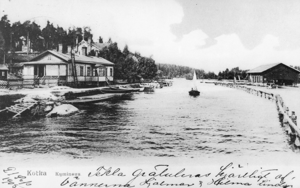 Hjalmar ja Hilma Lindén saivat tämän kortin ystävältään Teklalta 21. syyskuuta 1905. Ehkä Tekla oli saanut työpaikan Karhulan lasitehtaan konttorista.