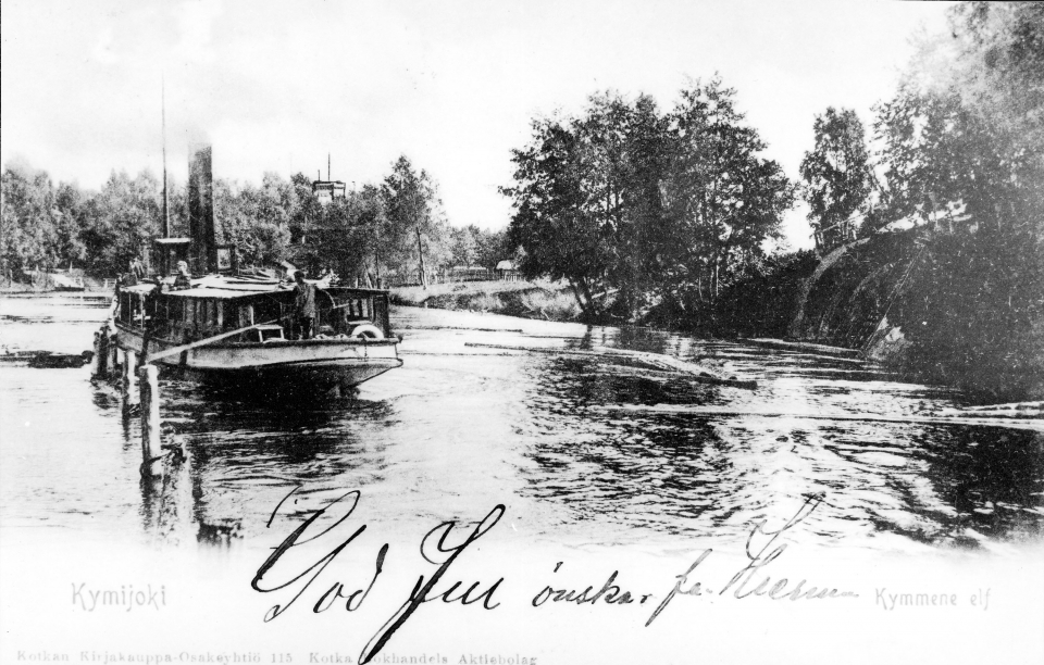 Hyvän joulun toivotukset Kymijoen vehreiltä rantamilta lähetettiin runsaat sata vuotta sitten. Vesibussi liikennöi Korkeakoskelta Kotkaan.