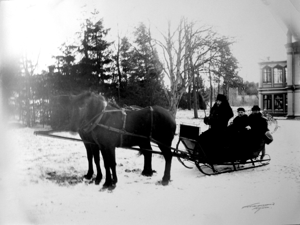 William Ruthin hevoset Hovin edustalla n. 1905. Oik. William Ruth ja vas. E. Chalhoub, joka oli aikeissa ostaa Karhulan tehtaat, mutta hanke laukesi.