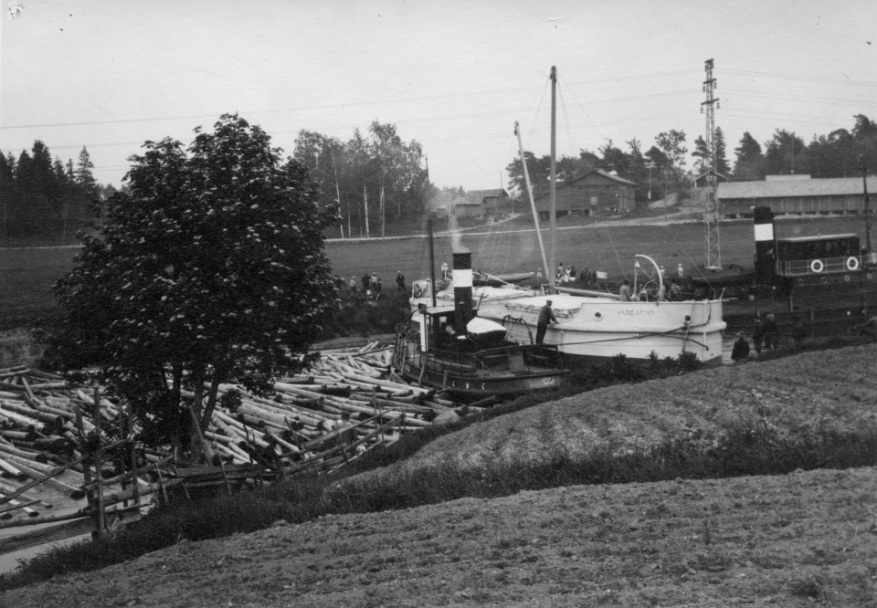 Panu-hinaaja ja Pargas 42 niminen laiva Kymijoella Eskolan Alahovissa n. 1930-luvulla.