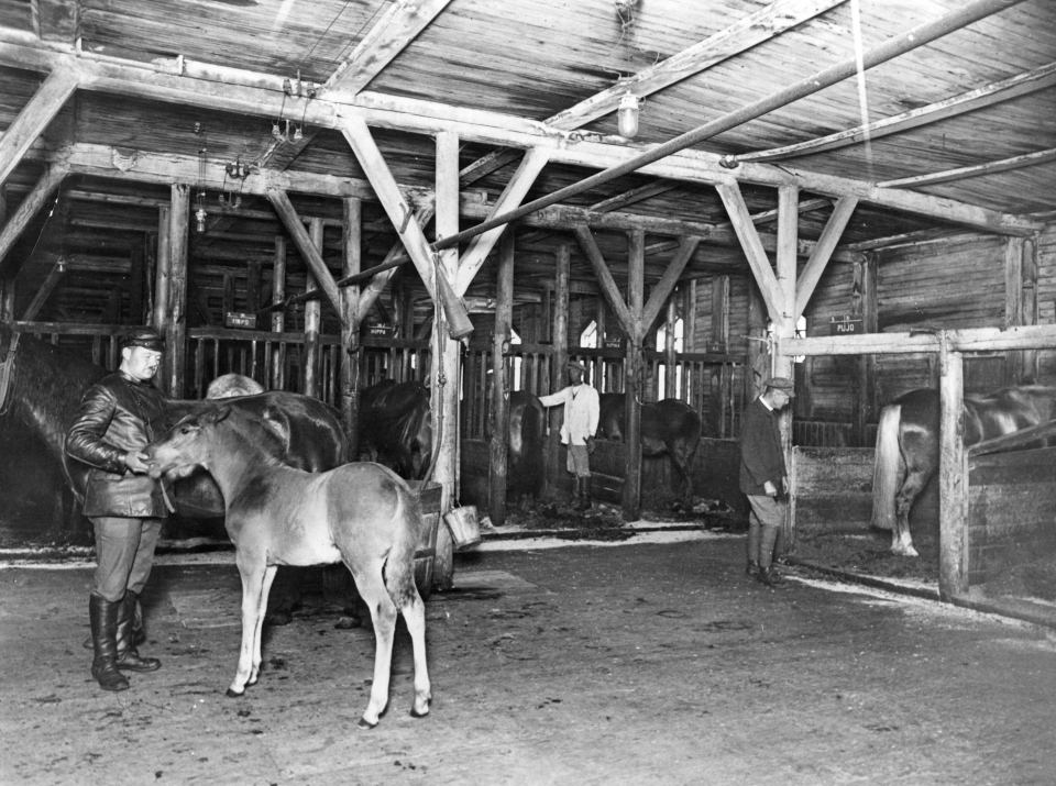 Karhulan Hovin vanha hevostalli, joka paloi vuonna 1926. Vasemmalla tallimestari Heinoja.